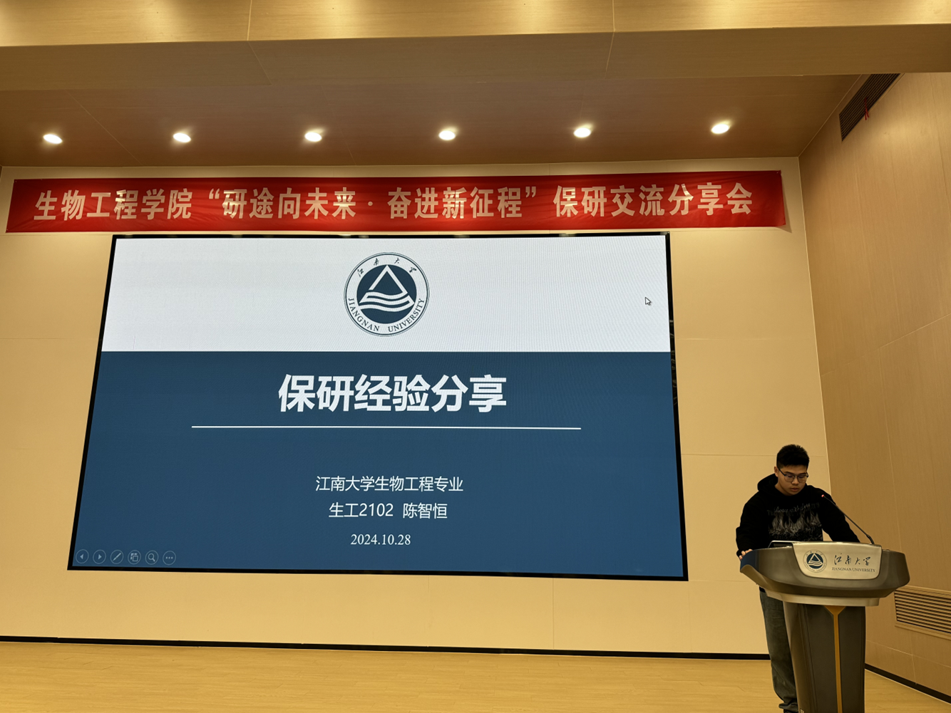 习近平总书记在给中国国际大学生创新大赛参赛学生代表的回信中提道:“创新是人类进步的源泉,青年是创新的重要生力军。”为积极响应党的二十大报告中提到坚定不移贯彻落实科教兴国战略,强化现代化建设人才支撑,10月30日晚,生物工程学院在第一教学楼1C109举办“研途向未来·奋进新征程”保研交流分享会,旨在加强本科生升学深造指导,充分发挥朋辈典型引领作用。生物工程学院分管本科学风建设、竞赛工作辅导员周杰,推免至双一流高校优秀本科生代表以及200余名在读本科生参会。会议由生物工程学院学习促进发展中心负责人卢洪晨主持。