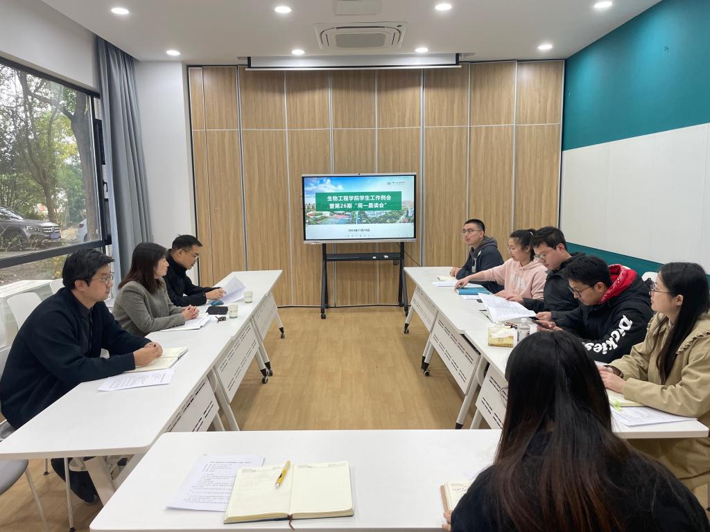 为不断提升育人水平和工作效能,生物工程学院学工条线施行周工作例会制度,结合“周一晨读会”辅导员队伍常态化学习品牌活动,实现“一周一学习”“一周一部署”“一周一研判”“一周一总结”,提升辅导员专业素养、加强工作统筹协调,凝聚集体智慧赋能育人工作,引领辅导员以更加饱满的热情和更加扎实的作风,奋力书写铸魂育人的时代答卷。