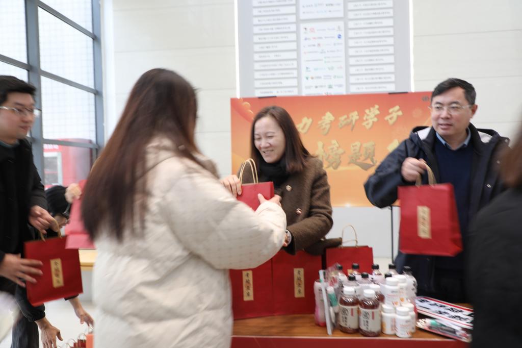 为坚定学生备考信心,调整迎考状态,12月6日上午,生物工程学院举行2025届毕业生考研慰问活动,学院党委书记程捷音,院长刘龙,副书记、副院长林丹,副院长陈晟,分团委书记周春江,毕业班班主任及辅导员韩俊为考研同学们送上加油助力包。