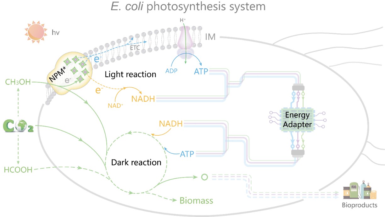 自然光合作用由光反应和暗反应组成,将太阳能和大气中的二氧化碳转化为生物质,以用作食物、木材和生物燃料。然而,实施大规模的自然光合作用面临着诸多限制,例如与人类生存至关重要的农业和林业资源的竞争、较困难的纤维素生物质加工处理以及不确定的气候条件变化。蓝细菌和藻类利用其天然的光合作用建立了光驱动的微生物细胞工厂,有效地解决了上述限制并实现了碳负性生物制造。尽管取得了这些进展,但也面临着新的挑战,包括可用性有限的合成生物学工具包、较长的生长周期以及需要满足工业需求的生产力。为了克服这些挑战,刘立明教授与中南林业科技大学刘高强教授联合带领团队通过重组和模仿光合细菌中光合作用的核心结构元件及功能,在大肠杆菌中设计开发了全新的人工光合作用系统,加强了一碳底物的利用以实现负碳制造。