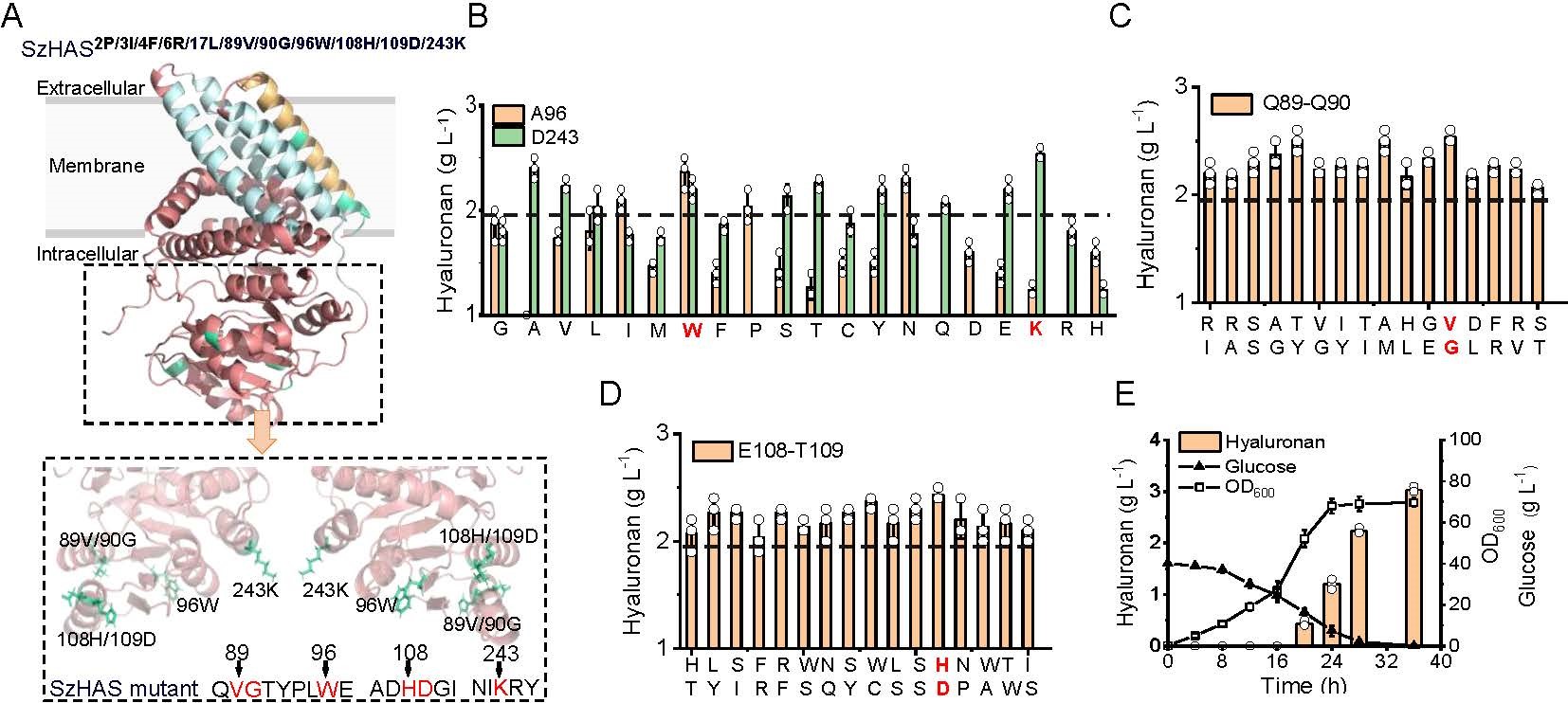 随后,作者基于结构预测,针对SzHAS催化域中12个非保守位点进行系统性突变筛选,经筛选发现,Q89V/Q90G、A96W、E108H/T109D和D243K突变可显著提高HA产量。在突变株SzHAS2P/3I/4F/6R/17L基础上构建突变体SzHAS2P/3I/4F/6R/17L/89V/90G/96W/108H/109D/243K,其HA合成能力得到显著增强,较基础突变株提升50%。
