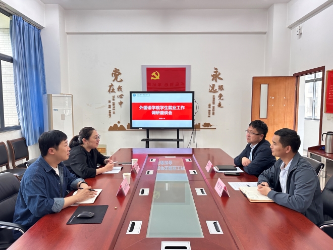 4月23日下午,外国语学院在文科楼A331会议室召开学生就业工作调研座谈会。学校就业指导中心主任兼学生工作处副处长孔丽丹、校学生工作部(处)副科级干部孙博文一行赴外国语学院,就2025届毕业生就业工作展开专题调研。学院党委副书记、副院长季王飞,辅导员苗文建参加本次调研座谈会。