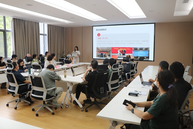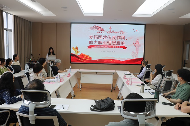 英语系党支部书记谢瑜以“样板赋能,推动学院和专业发展”为主题回顾了英语系党支部创建样板党支部的各项工作,围绕品牌活动、助力扶贫、学科融合三方面展示了支部积极探索党建工作创新、“一融双高”发挥外语人专长的丰富成果,并交流了下一阶段支部建设的目标和规划。