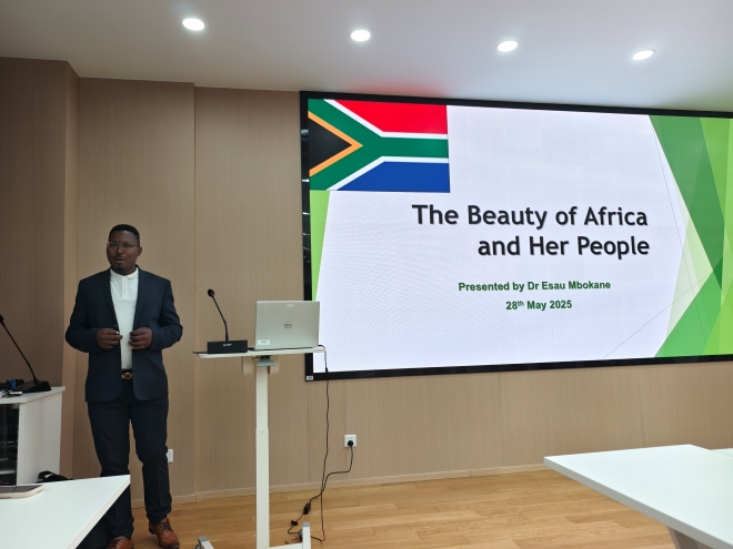 5月28日晚,南非林波波大学农业与环境科学学院高级研究员埃绍·马修斯·姆博卡内博士(Dr. Esho Mathews Mbokane)来到外国语学院,以“Dialogue with World’s Diverse Cultures—Exploring South Africa”为主题开展要闻。外国语学院副院长顾琦一参加讲座,讲座由学院曹丹老师主持,外院师生五十余人参与了本次讲座。