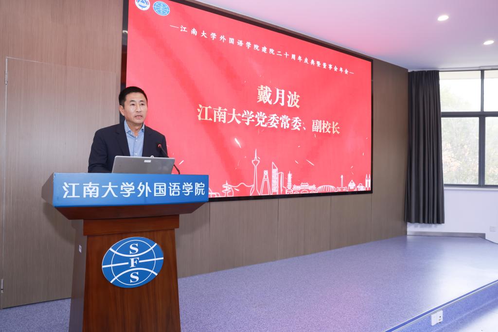 戴月波致辞,首先对外国语学院建院二十周年表示热烈祝贺。他高度肯定外国语学院建院二十年来始终坚守立德树人初心,秉承“融通文明,道弘天下”的院训,在学科建设、人才培养、科研创新、社会服务等领域取得了令人瞩目的成绩,已成为学校国际化人才培养和中外文化交流的重要阵地。同时,向支持学校及学院发展的各界人士致谢并发出邀约,期待校友常回母校、董事单位持续支持学院发展,希望学院以建院二十周年为新起点,持续深化改革、锐意进取,在“外语+”交叉融合发展中打造特色品牌,为学校“双一流”建设和国家外语教育事业发展贡献更大力量。