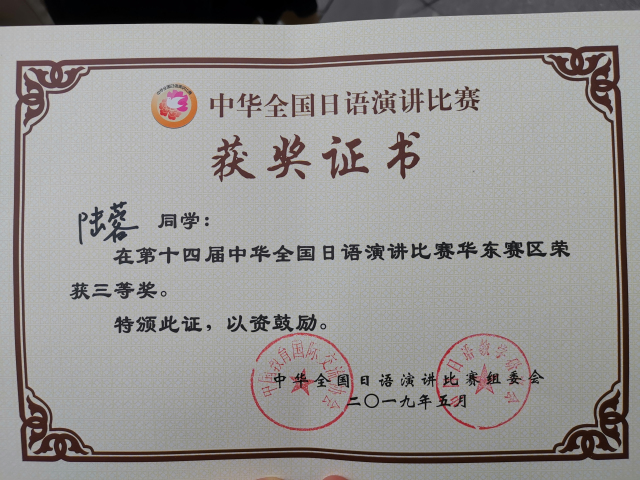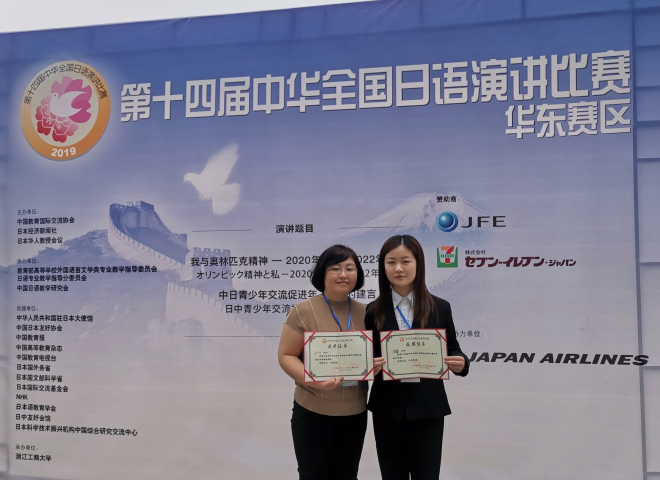 比赛分命题演讲和即兴演讲两部分。上午,选手们围绕“我与奥林匹克精神——2020年东京,2022年北京”“中日青少年交流促进年——我的建言”两个主题,开展了限时5分钟的命题演讲。选手们演讲内容贴近生活实际,抒发了真实感悟,用真诚打动观众,以演讲注解心声。下午为限时3分钟的即兴演讲,选手们围绕“从古代的智慧中能学到什么”的主题展开演讲。即兴演讲考验的是选手们的知识储备量以及临场应变能力,比赛更显激烈、紧张。我校选手陆蓉以扎实的语言功底和较强的临场应变能力获得三等奖,崔明姬老师获优秀指导教师奖。