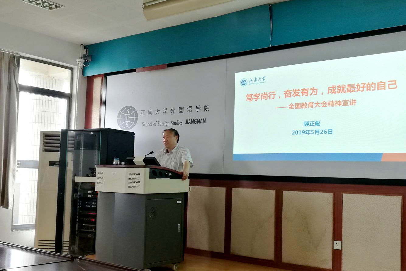 2019年5月26日下午,江南大学副校长顾正彪教授走进2C618教室,给外国语学院150余名17级、18级本科生讲授了一堂主题为“笃学尚行,奋发有为,成就最好的自己——全国教育大会宣讲”的形势与政策课。学院党委副书记刘伯贤、分团委书记杨艳、分团委副书记张圆到场听课。