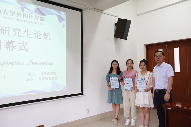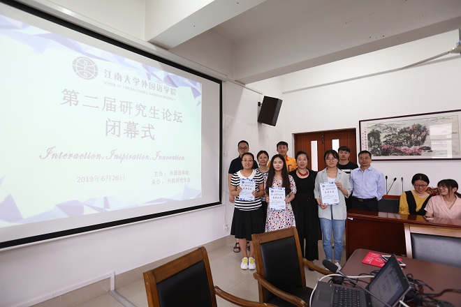 随后,朱义华宣读优秀论文评选结果,在座导师和学院领导共同为获奖同学颁奖并合影留念。本届论坛获奖名单如下(按拼音顺序):一等奖:白雅冰、王籽运、吴佳;二等奖:李月杉蔓、王雅琴、项蓉、赵凯琪、周泽宇;三等奖:王童、吴吉星、张倩瑶、张瑜、郑童。随着颁奖典礼的结束,外国语学院第二届研究生论坛也圆满落下了帷幕。