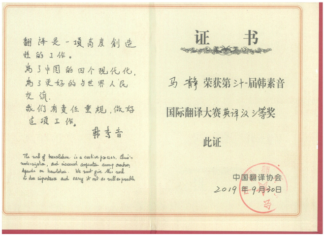 马静获奖证书