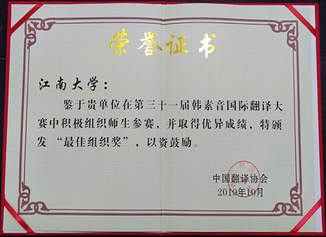 2019年第三十一届韩素音国际翻译大赛由中国翻译协会、北京外国语大学、福建师范大学联合主办,《中国翻译》编辑部、北京外国语大学高级翻译学院、福建师范大学外国语学院联合承办。大赛汇聚了来自国内外各个行业的优秀参赛者,共收到有效参赛译文11900份。经过三轮的严格评审和终审讨论,共评出获奖者346名,得奖率仅为2.9%。鉴于我校积极组织学生参赛,并取得优异成绩,我校荣获大赛组委会颁发的“最佳组织奖”。
