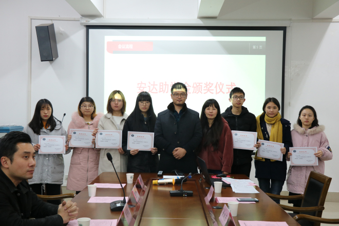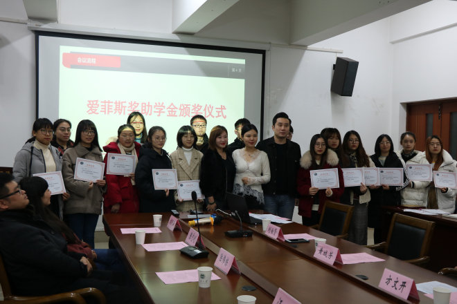 12月24日下午,2019年外国语学院社会奖助学金颁奖仪式在学院A349会议室举行。外国语学院党委书记黄城芳、院长方文开、党委副书记刘伯贤、外国语学院分团委书记杨艳、教师胡燕萍、江苏艾菲斯医院管理有限公司代表陆伟栋、无锡安达汽车综合性能检测有限公司代表陈志刚以及受助学生参加颁奖仪式。颁奖仪式由学院分团委副书记张圆老师主持。