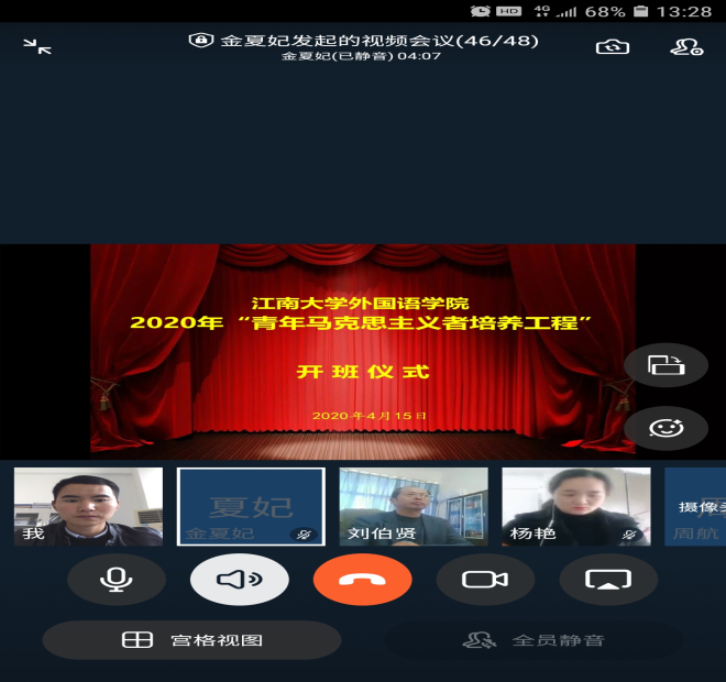2020年4月15日下午1:30,江南大学外国语学院青年马克思主义者培养工程训练营(以下简称院“青马工程”)开班仪式在钉钉平台举行。学院党委副书记、副院长刘伯贤,分团委书记杨艳,辅导员苗文建以及本期43名青马训练营成员参加“云端”开班仪式。开班仪式由分团委副书记张圆主持。