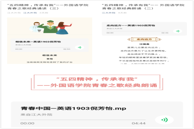 五四风雷,激荡百年;五四精神,薪火相传。五四期间,外国语学院利用学院微信公众号推出三期青春之歌经典朗诵分享。第一期推出《青春中国》,第二期推出《走向远方》、《山高路远》,第三期推出《相信未来》、《热爱生命》。通过诵读经典,引导学生从经典中汲取精神力量,进一步加深对五四精神内涵的理解。