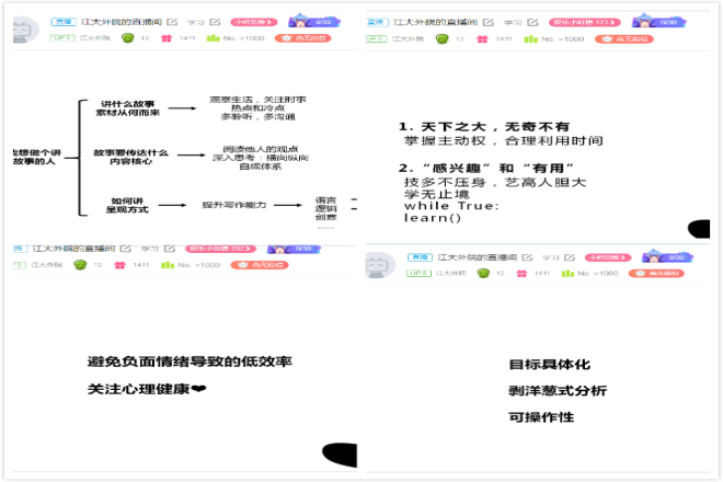 本次分享会邀请了外国语学院英语1602班左铭瑶同学进行青春分享。左铭瑶同学三次荣获国家奖学金、远翔奖学金留学类特别奖、江南大学十佳青年、2019外研社杯全国英语写作大赛总决赛二等奖等荣誉,现已保研至中国传媒大学国际新闻学。分享会主要围绕“目标的具体化”、“立足专业学习,拓宽自己的兴趣面”、“聊聊情绪管理与高效学习这件事”三个方面进行。