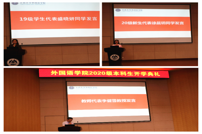 开学典礼开始前,参加典礼的师生进行现场测温,并采取隔位的方式安排座位。大会在庄严的国歌声中拉开帷幕。首先,由学院党委书记史志洪致欢迎辞。他首先欢迎2020级新生加入外院大家庭,在谈到如何过好大学生活时,他指出:大家要坚定理想信念,做好当下的学业规划,在前行的路上不断挑战突破自己。之后,由教师代表李健雪教授发言。李教授主要分享了青年的学习状态和青年人的理想,“树立远大理想,专业上科学学习方法,青春不留遗憾”引发了新生们的思考。在学生代表发言环节,19级学生代表盛晓妍同学用三组词——人与众、忙与闲、星空与大地给新生们提出了中肯的建议。20级新生徐晨玥同学代表全体新生站在新的起跑线上热情发言,表达了对未来学习生活的憧憬。会议最后,院长方文开教授以“道”为切入点,为新生解读了“笃学尚行,止于至善”的江大校训,分别从为学、为世、为人三个方面给新生提出期望。最后他说:语言的学习要注重融合,在明确目标的基础上要指定详细的计划,大学期间多读经典著作。