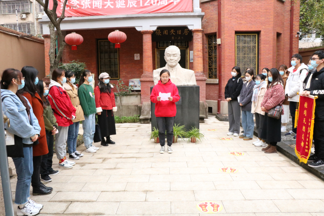 参观完毕后,英语1805全体学生及共建党支部党员同志围绕着张闻天的石像站成两排,戴符以及刘佳同学作为学生代表发言。两位同学对于张闻天同志的生平做了一些更为细致地讲解,刘佳同学讲述了张闻天同志在文学翻译以及哲学方面的成就以及他进言直谏,刚正不阿的精神,使我们认识到“共产党人要有面对赤裸裸现实的勇气,要有说老实话的勇气”。戴符同学则对张闻天先生一生所遭遇的迫害以及不争权、不盲目尊崇、不计较个人得失的精神进行了一番较为细致地讲述,使我们认识到无产阶级应当无条件忠于人民、坚持真理、不断探索、砥砺前行。