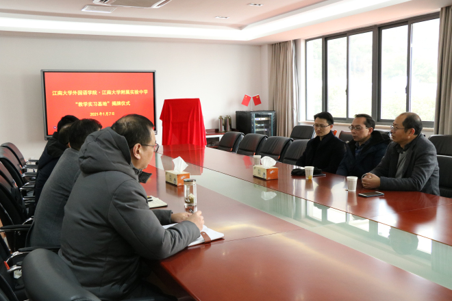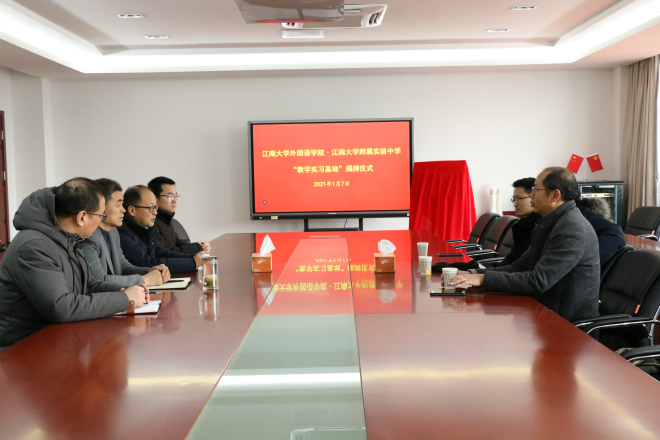 1月7日上午,外国语学院与江南大学附属实验中学共建“教学实习基地”揭牌仪式在江南大学附属实验中学六楼会议室举行。学院院长方文开、党委副书记刘伯贤、副院长朱义华、滨湖区教育局副局长吴仁昌、附属实验中学校长吴卫东、校党总支书记王星、副校长陈柏林参加了签约仪式。