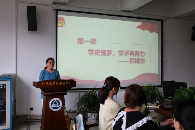 最后,郭锡华为学员带来了第一讲——《学史圆梦,学子再奋力》。首先,她结合自身经历,讲述了学习中国共产党简史的心得,强调了学习百年党史的重要性,指出“初心”关键词,告诫我们要时刻牢记初心,坚守初心。郭锡华分享了新时代对外语人的新要求,希望外院学子深入专业方面的研究,争做国际复合型人才,让初心薪火相传,把使命勇担在肩。