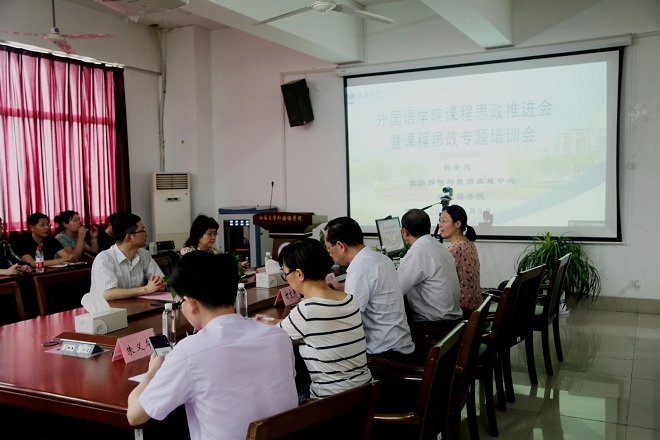 为进一步提高立德树人成效,提升教师开展课程思政建设的意识和能力,6月9日下午,江南大学外国语学院联合学校教务处、教学评估与教师卓越中心共同举办了“课程思政推进会暨课程思政专题培训会”。江南大学副校长张凌浩致欢迎辞,四川外国语大学校长董洪川、江南大学教务处副处长孙子文应邀做了专题讲座。本次会议分线下和线上两个会场,线下会议设在文科楼A349,线上会议通过腾讯会议直播,外国语学院全体教师及其他学院感兴趣的教师共同参加了本次培训。本次会议由外国语学院院长方文开主持。