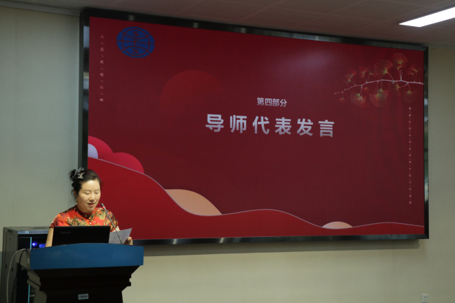 导师代表张俊萍表达了对同学们的美好祝福和殷切期望。张俊萍表达了三个愿景:一愿毕业生们一往无前地放眼世界,拥抱世界;二愿毕业生们勇敢地扛起家庭责任,扛起幸福担当;三愿毕业生们在艰难的拼搏中原谅生活,热爱生活。最后送给同学们路易斯·格丽克End of Winter中的一句诗作为结语,希望同学们不忘初心,逐梦远航。