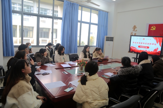 为总结2022年外国语学院学生党建工作,同时更好的学习宣传贯彻党的二十大精神,12月1日下午,外国语学院在A331会议室开展2022年度学生党支部书记述职评议考核工作。学院党委副书记副院长刘伯贤、分团委书记陆芳、5个学生党支部的支部书记、党员代表参加了此次会议。