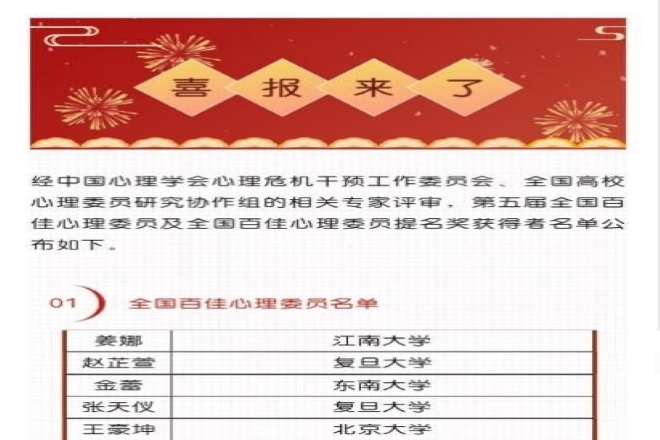 我校首次参与该论坛学习,并推荐外国语学院英语专业2004班姜娜作为“全国百佳心理委员”候选人参评。通过学校推荐、个人事迹网络展示及投票、专家评分等环节产生,我校推荐的姜娜同学不负众望,冲出500名选手的重围,荣获“全国百佳心理委员”称号,更是夺下仅14个名额的心理论坛副主席一职。这是江南大学历史上第一次在此类赛事上斩获殊荣。姜娜同学一马当先,为江南大学摘得这项荣誉,增光添彩。姜娜同学的获奖,不仅是对她个人的肯定,也是对外国语学院以及我校心理委员队伍建设工作的认可。