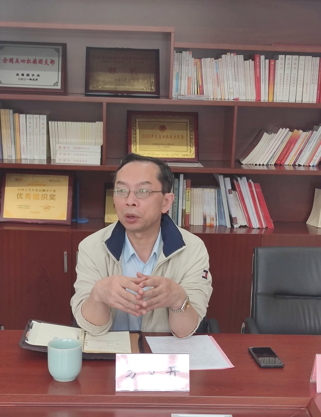 刘影对学院的热情接待表示感谢,并介绍了北京工商大学外国语学院的基本情况;关涛主要介绍了学院国际合作办学和MTI建设相关工作。