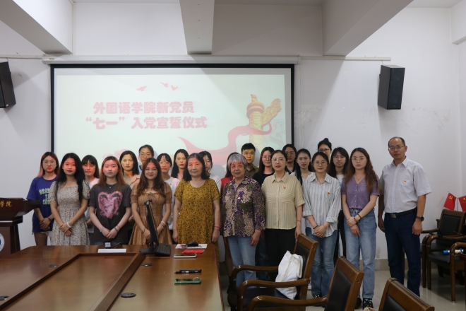 时值“七一”来临之际,为教育党员始终保持党的先进性,激发新党员的责任感和使命感,不忘初心,外国语学院在6月19日于外院楼A349举行新党员“七一”入党宣誓仪式。外国语学院党委副书记刘伯贤、关工委常务副主任鲍国庆、委员吴艳敏、分团委书记陆芳出席宣誓仪式。本次活动共20名新发展党员参加,分团委书记陆芳主持会议。