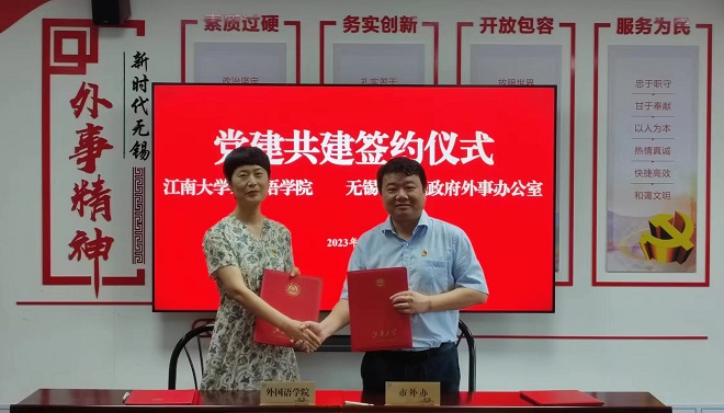 双方签订《江南大学外国语学院与无锡市外办共建协议》《江南大学外国语学院党委与无锡市外办党委共建协议》《外国语学院英语系支部、研究生支部—市外办翻译支部共建协议》。