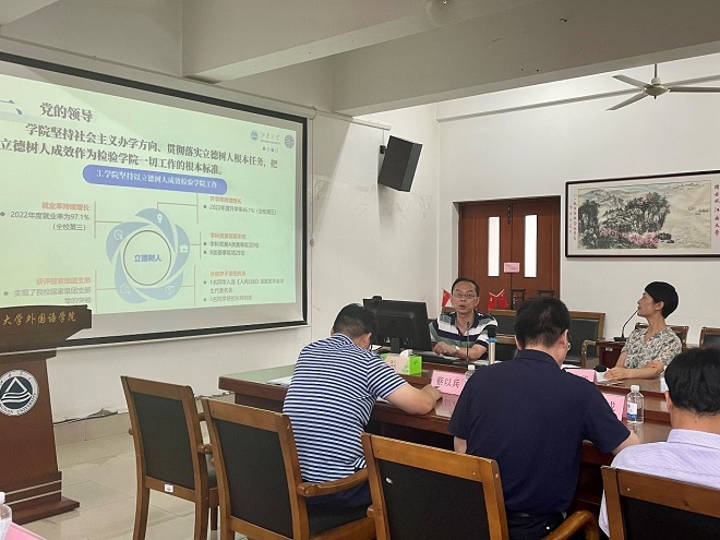 7月27日下午,学校组织校内评估专家组赴外国语学院开展第二轮模拟评估。校党委常委、副校长堵国成,教务处处长李兆丰,原卓越中心主任刘和,实验室与资产管理处处长蔡以兵,教务处副处长吴宝锁,人文学院副院长于书娟、马志强以及审核评估专班相关人员出席评估会。外国语学院领导班子、审核评估工作领导小组及各项工作小组主要成员参加。院党委书记李荣华主持本次模拟评估。