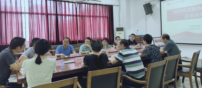 8月18日上午,教务处处长李兆丰率领导班子成员一行6人赴外国语学院调研指导教育教学工作。学院党政班子全体成员、院长助理、系部主任等参加了调研交流会议。外国语学院党委书记李荣华对教务处莅临指导表示欢迎和感谢,希望通过此次交流为迎评促建和修订人才培养方案带来新启发。