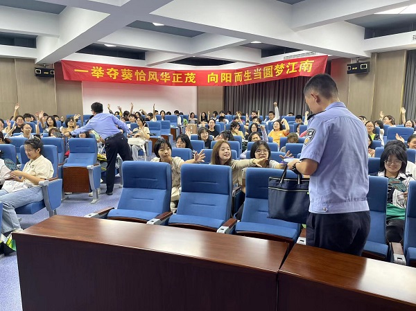首先,由无锡市公安局滨湖分局雪浪派出所的杨恺警官进行新生防诈反诈安全教育。杨恺从电信诈骗、游戏诈骗、刷单诈骗、情感诈骗等四个方面,详细解读了各类诈骗行为,深入剖析宣防对象的心理独白,并通过生动形象的案例、有趣的互动问答,警示新生提高反诈意识,保护自己的财产安全,谨防诈骗。
