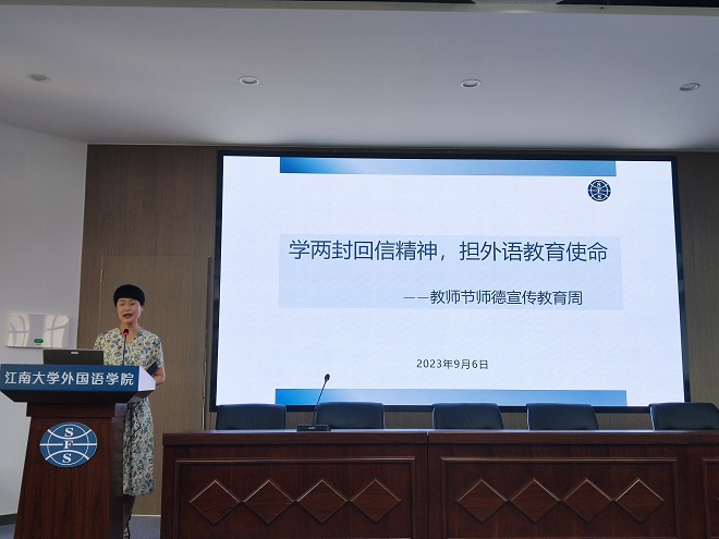 李荣华以“学两封回信精神,担外语教育使命”为题,开启了学院师德教育宣传周系列教育活动。她带领大家重温了习近平总书记给北京外国语大学老教授的回信和习近平总书记给外文出版社的外国专家的回信,勉励教师们努力培养有家国情怀、有全球视野、有专业本领的复合型外语人才,履行外语人使命担当,做好中华文化外译和外宣,促进学院奋进发展。