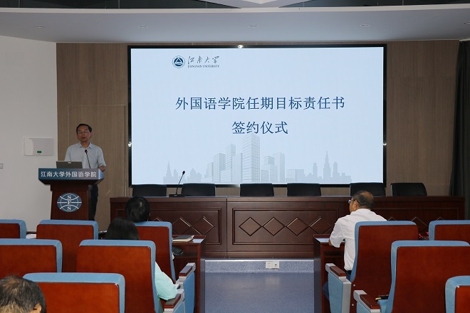 外国语学院院长方文开作江南大学本科教育教学审核评估学院动员。方文开传达了学校教育审核评估动员大会上的会议精神,要求全院教师将以“奋进计划”为引领,以迎接新一轮教育部本科教育教学审核评估为契机,坚持以评促建,以评促改、以评促管,用实际行动回答“教育强国 江南何为”的时代答卷。之后,李荣华方文开代表学院与各系部签订了第八轮任期目标责任书。