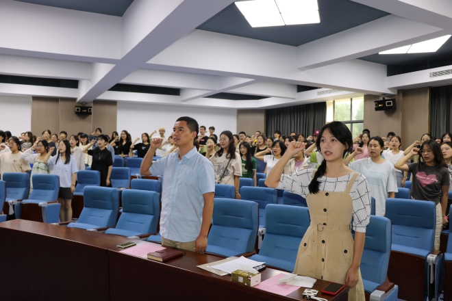 外国语学院2022级学生军训动员大会于9月27日下午在学院君金报告厅举行。外国语学院党委副书记、副院长刘伯贤,22级带训辅导员苗文建,21级军训优秀学员代表以及22级全体学生参加会议。