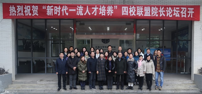 12月15日,“新时代一流人才培养”四校联盟院长论坛在外国语学院A349召开。南京航空航天大学外国语学院院长范祥涛与副院长徐以中、南京理工大学外国语学院院长杨蔚与副院长赵熠玮、河海大学外国语学院院长张海榕与副院长季莉、江南大学外国语学院党委书记李荣华、院长方文开、领导班子成员和骨干教师集聚一堂,共同探讨提升高校思想政治教育效果和提高一流人才培养质量的路径,我校教务处副处长孙子文出席并致辞。