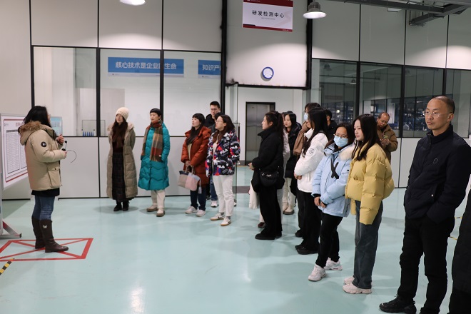 活动第一站,学院师生来到扬州环保科技产业园,参观江苏博一环保科技有限公司。博一环保是国内环保行业细分市场上知名度高、应用量广、用户满意的品牌。走访过程中,师生了解到,公司高度重视技术创新与生产质量,销售网络遍布全国并远销欧洲、美洲和东南亚等多个国家和地区。负责人提到,由于与国际客户对接联系的需求不断增加,公司对于外语人才的需求也逐步提高。李荣华表示,外国语学院致力于培养具有全球视野、熟练运用外语、晓通国际规则的新时代外语人才,希望能够加强与企业的交流协作,发挥各自优势,打造具有外国语学院特色的校企合作模式。