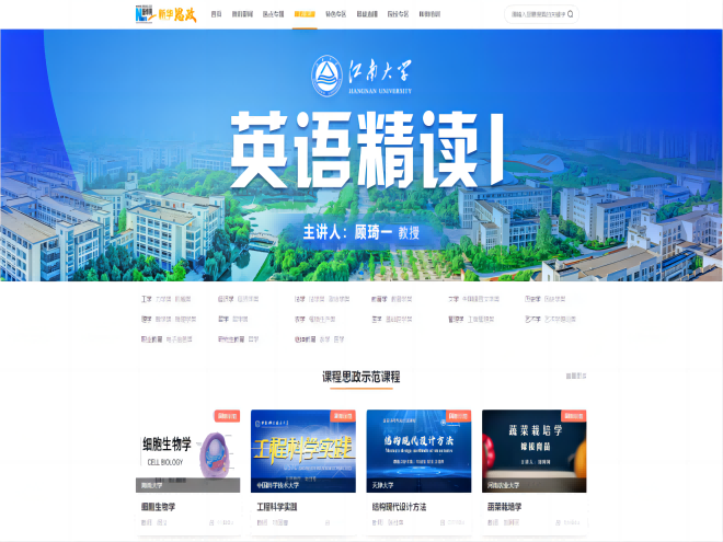 《英语精读I》是英语专业基础课,江苏省一流本科课程,江南大学课程思政示范课程。课程运用“4C阅读模式”推动学生从文本理解(Read to Comprehend)、批判思维(Read to Critique),到强化巩固(Read to Consolidate)、创新实践(Read to Create)层层推进,提升学生高阶思维能力和创新实践能力,增强了学生“理解中国、沟通世界”的英语综合素养。