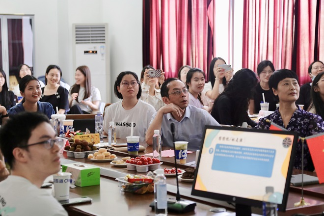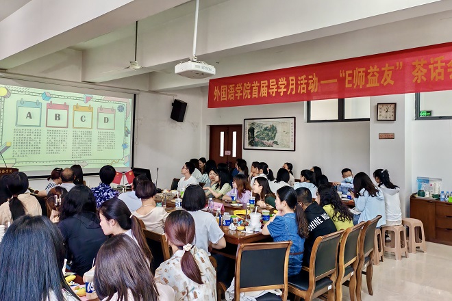 为促进研究生导师与学生的交流沟通,增进彼此间的信任与了解,同时为学生提供一个表达困惑、交流心得的平台,外国语学院党委书记李荣华、外国语学院党委副书记刘伯贤、外国语学院分团委书记顾海星、教务秘书华清和多位导师和外国语学院全体研究生于6月3日下午共同参加外国语学院首届导学月“E师益友”茶话会活动。
