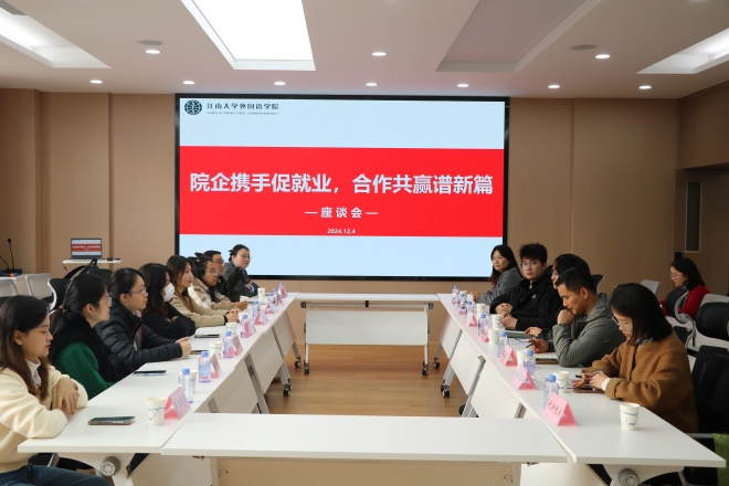 为进一步强化院企合作,深入推进产教融合,提升人才培养质量,推动毕业生实现高质量充分就业,12月4日,外国语学院在A349会议室开展院企合作交流座谈会。江苏国泰华盛实业有限公司、弘元绿色能源股份有限公司、无锡金丽洁国际贸易有限公司等十余家企业来访交流,外国语学院党委书记李荣华,党委副书记、副院长季王飞,辅导员苗文建参加座谈。