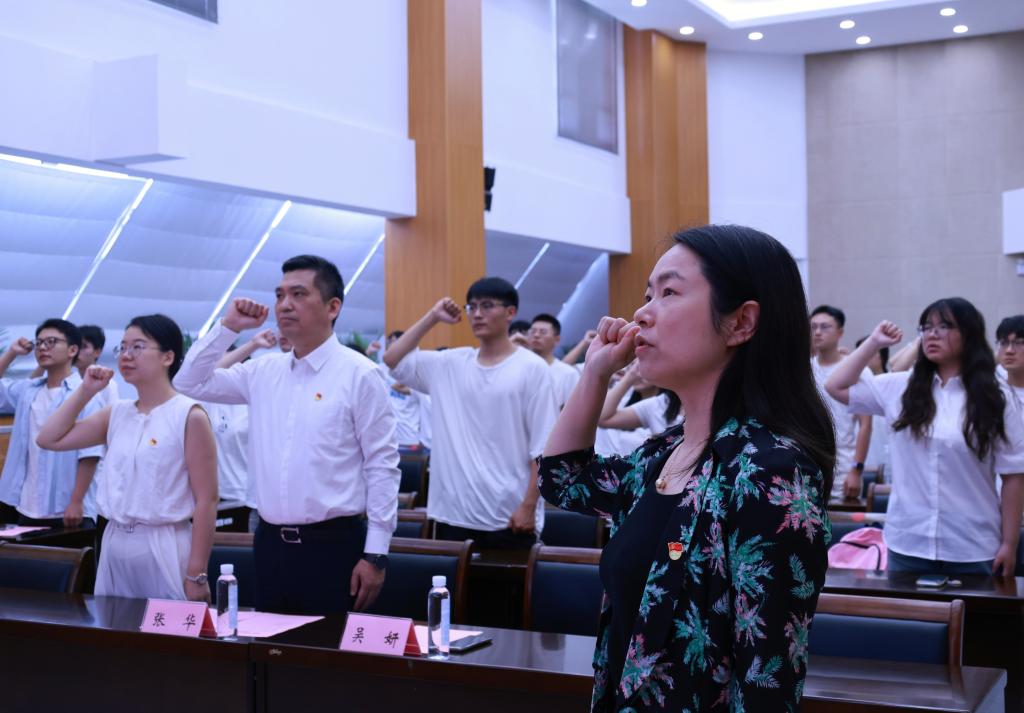 为庆祝中国共产党成立104周年,引导新党员牢记初心使命、坚定理想信念,6月27日上午,物联网工程学院在D328会议室举行2025年新发展党员“七一”入党宣誓仪式。学院党委书记张华,党委副书记、副院长吴妍,学工办主任兼分团委书记洪筱及全体新老党员代表参加仪式。大会由学院专职组织员孟召双主持。