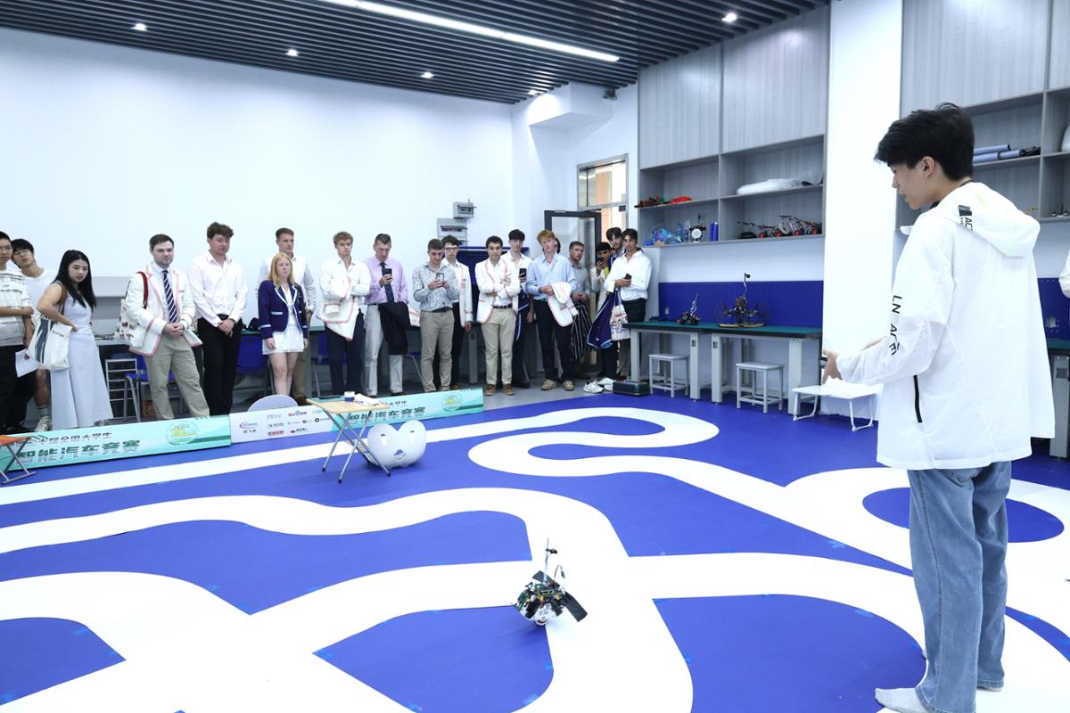 江南初见:历史与创新的融合。活动伊始,赛艇队成员参观了江南大学校史馆,深入了解学校发展历程与文化传承,感受其厚重的学术底蕴。随后,大家来到物联网工程学院大学生创新实践基地,走进智能机器人俱乐部、电子设计俱乐部和RoboMaster俱乐部等创新社团。同学们现场演示了智能机器人、电力电子装置和智能无人机等创新成果,并结合竞赛和科研经历分享了实践故事。中英青年围绕技术进行了交流,在互动中共同探讨科技应用前景,现场气氛热烈。