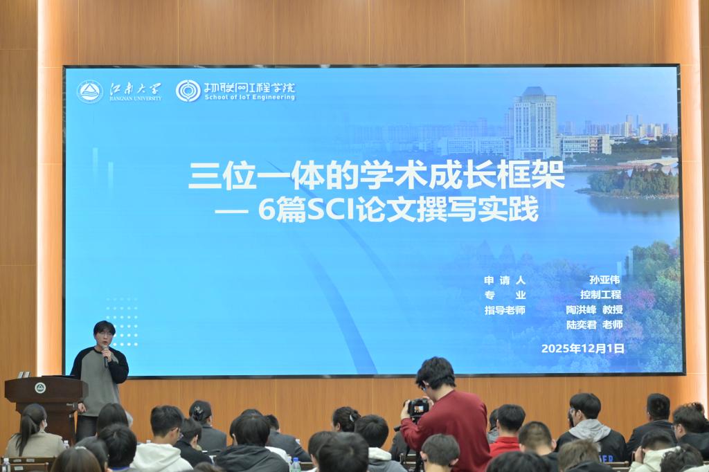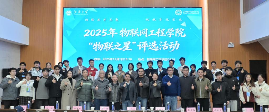 12月1日晚,物联网工程学院2025年“物联之星”先进个人评选活动在学院D328报告厅举行。物联网工程学院党委副书记、副院长吴妍,副院长陶洪峰、王子赟,分团委书记兼学工办主任洪筱,关工委常务副主任吴锡生,关工委委员朱凯元、赵曾贻,及全体辅导员出席活动,本硕博18位参赛选手及150余名学生观众共同参加活动。