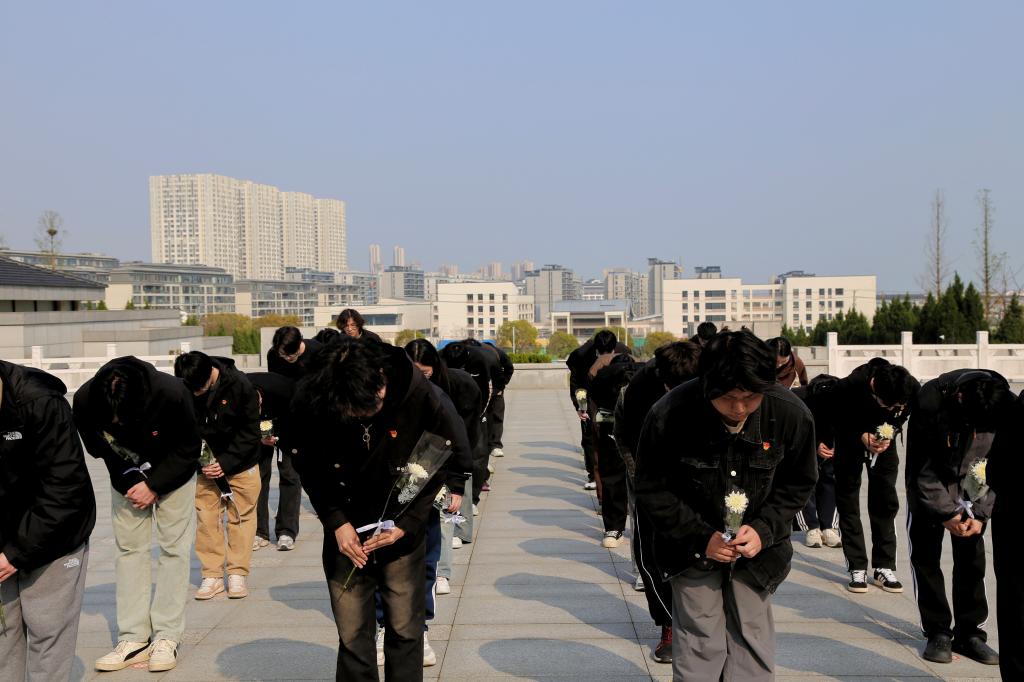 国歌奏毕,全体人员低头默哀,向革命烈士三鞠躬,以最庄重的方式,寄托对英烈的哀思与敬仰。默哀结束后,师生们依次上前,亲手将洁白的菊花敬献在纪念碑前,每一朵白菊都承载着对先烈的深切怀念,每一次驻足都传递着新时代青年传承红色基因、赓续红色血脉的坚定决心。