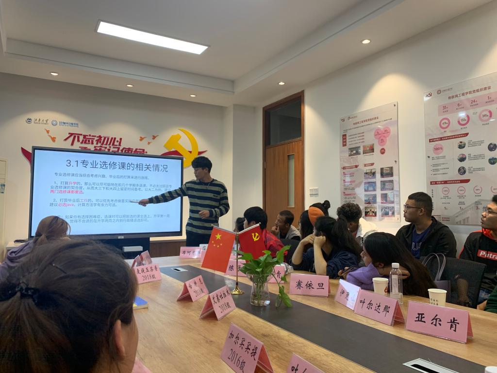 随后,学生代表进行发言。2016级优秀学生代表加尔买买提·艾布德开勒木就自己备考国家电网的经历,从职业规划,考试备考方法等方面全面分享了自己的求职经验,建议学弟学妹们要及早做好大学生涯规划,确定好自己考研、保研或就业的中长期目标,并将其细化落实在每一个小目标的实现当中。2017级学生代表吐尔逊阿依·吐尔迪作为学院老师们人人称赞的学生骨干,从社会工作,职业生涯规划等方面分享自己在江南大学三年以来的深刻体会并祝学弟学妹们学业顺利,愉快地度过自己的大学生活。大学生退役返校学生艾赛吐拉木从他入学再到做入伍决定以及艰苦又刻骨铭心的军旅生活谈起,感叹返校之后的江大翻天覆地的变化,并表示,很庆幸自己的青春有军装的样子!从预科班毕业再到物联网学院的2018级学生恰特克,通过幻灯片介绍关于计算机科学与工程专业满满的干货,将本次交流会的气氛带向高潮,现场同学都纷纷拿起手机拍下PPT上的内容,收益颇多。