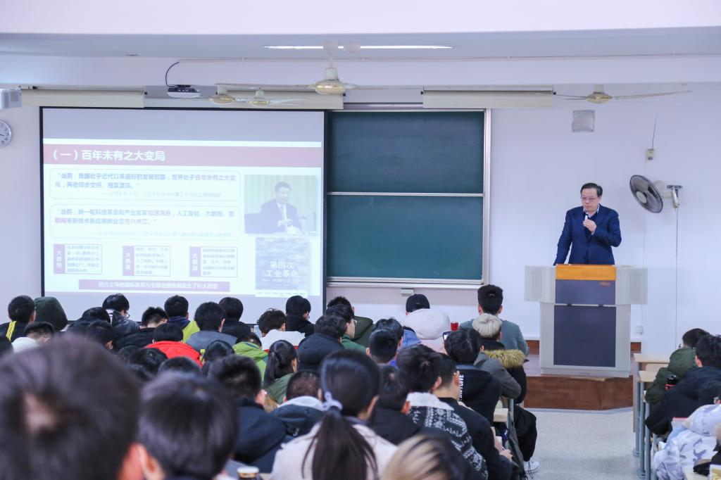 12月27日下午,在第二教学楼D308教室,校党委书记朱庆葆教授面向物联网工程学院2018级电气工程、自动化专业250余名同学讲授形势与政策课。学院党委副书记、副院长耿向阳等参加了此次形势与政策课。