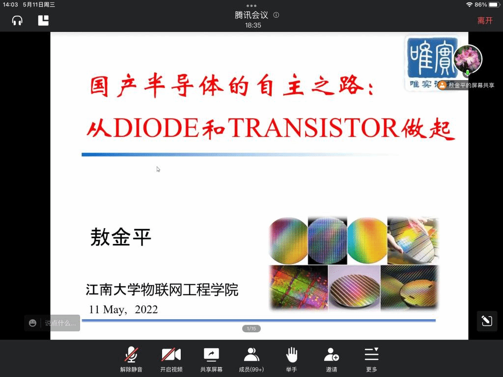 敖金平报告的题目是《国产半导体的自主之路》。他围绕专业知识,由浅入深地介绍了半导体,特别是宽禁带半导体的基本原理和器件,通过具体实例向同学们生动讲述宽禁带半导体在光电、电力电子、微波通信和无线充电等新型电子领域的相关成果和应用,并给出自主发展宽禁带半导体的方法和方向。
