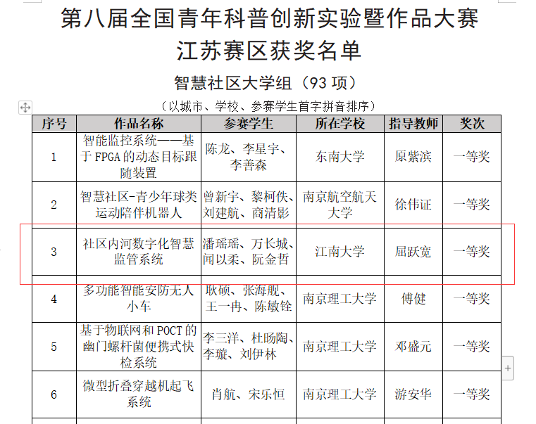 近日,第八届全国青年科普创新实验暨作品大赛(江苏赛区)决赛在南京科技馆落下帷幕,共有来自30所高校、95所中学的2700余人参与赛事活动。经各赛项初赛、复赛评审及现场比赛等环节的激烈角逐,我校物联网工程学院作品“社区内河数字化智慧监管系统”获评一等奖,并成功推荐至国赛(全省仅6项)。