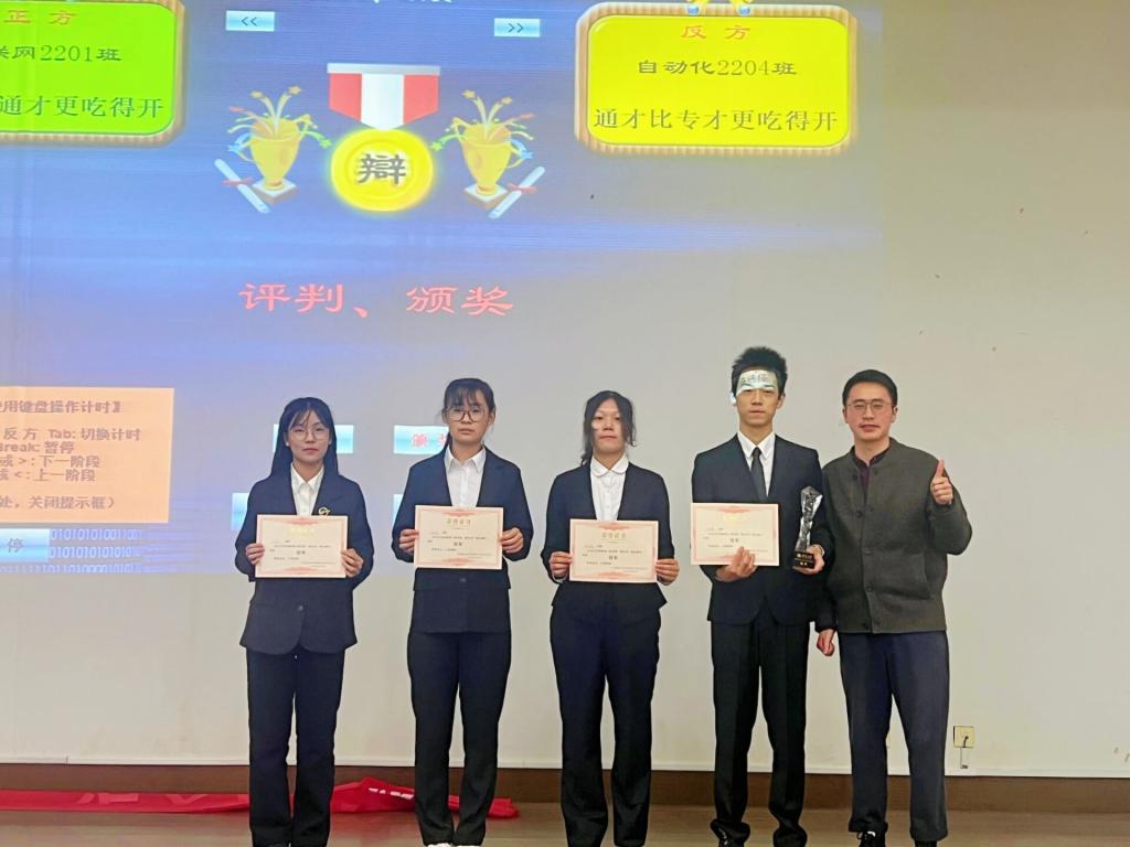 本届辩论赛自9月份启动以来,经过小组赛、半决赛等两个多月的紧张角逐,物联网2201班和自动化2204班从14支参赛队伍中脱颖而出,成功晋级决赛。决赛中,两队围绕“专才/通才谁更吃得开”这一辩题各抒己见,口吐莲花,舌战四方。双方辩手简单的自我介绍过后,激烈紧张的辩论赛正式开始。首先,正方开篇立论,将专才定义成某一方面专精,同时其他领域也有所涉及的一类人才,并将“具有核心竞争力,在社会上受欢迎”作为“吃得开”的定义,以三个分论点展开论证。随后,反方四辩质询了专才对其他领域的了解程度,并对正方的判准进行了滑坡。反方一辩立论中提出了不同的定义,认为专才就是精通一个领域,他们的判准则是“吃得开”要看“个人能为社会做什么”以及“社会能给个人多少资源”两个方面。正方四辩随后质询,设下重重陷阱,而反方一辩反应迅速,不断重申己方定义,并对原有的定义作出了更精细的诠释。整场比赛中最激烈的自由辩论环节中,双方依据三辩小结环节确立的主战场,围绕“专才和通才谁更擅长创新”“是不是受到欢迎就是吃得开,看得见的才是能力”这两个问题展开了紧张激烈地讨论,双方持续交锋,火花不断。双方攻得精彩、守得漂亮,收获了观众评委一致的掌声。经过激烈角逐,本场辩论赛最后以正方物联网2201班获胜结束,同时反方一辩自动化2204班杨启航同学以其滴水不漏的接质询和自由辩中精彩的补论获得本场“最佳辩手”的称号。