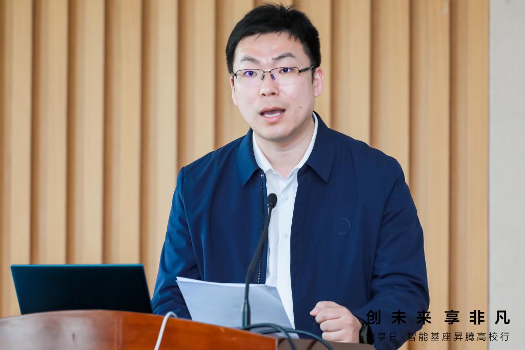 倪松涛代表学校致辞。他介绍了“智能基座”产教融合协同育人项目的背景和合作内容,肯定了江南大学-华为“智能基座”协同育人基地项目在过去的两年内取得的多项成果,并表示学校将持续深化产教融合协同育人,创新优化人才生态链,进一步推动双方在人才培养、课程建设、创新实践等方面更深层次、更广领域、更高水平的合作。